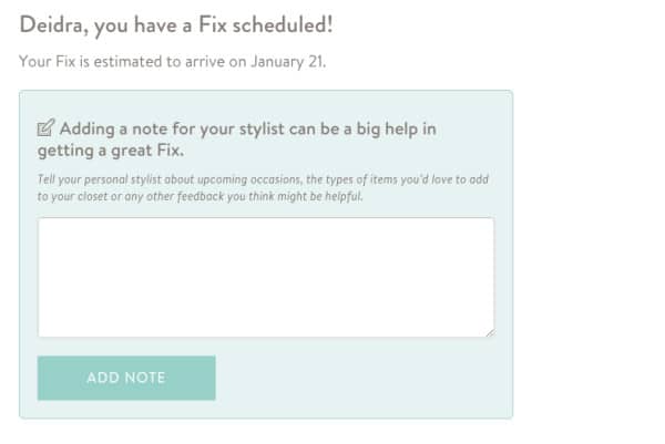With Stitch Fix, you have a different stylist each time you schedule a fix. On a couple of occasions, I’ve asked to talk directly with my stylist, but I was told that’s not possible. Granted, it has been a while since I’ve asked for a direct conversation, so things may have changed. But, it was disappointing not to be able to make that connection. With this in mind, when I scheduled this last Fix, I went into excruciating detail when I placed my order. Once you schedule your Fix, you’ll see a message on your screen that looks like this: